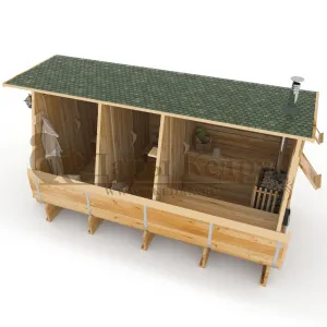 Это прямоугольное изделие с закругленными углами. За счет такой конструкции во время топки воздух циркулирует по кругу, поэтому баня-бочка нагревается не более 30 минут. Баня включает в себя раздевалку, моечную и парную. Во всех трех отделениях лавочки из кедра установлены с обеих сторон. Печь расположена в парилке около дальней стены. Для удобства пользования в бане висят полочки из кедра и вешалка в раздевалке. По вашему желанию баню-бочку квадро можно укомплектовать козырьком, верандой и печью с внешней загрузкой, благодаря которой весь мусор после топки остается на улице. Баня-бочка квадро не требует полноценный фундамент, поэтому при необходимости ее можно перенести в другое место.