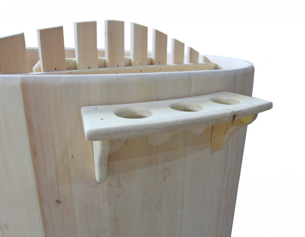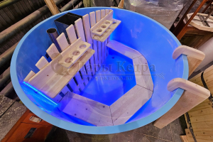 Это уличная подогреваемая купель с круглой внутренней чашей из термопластика. Для удобства пользования купель оборудована лавочками, приставной и внутренней лестницей. Нагрев воды происходит за счет встроенной печи, которая находится внутри купели за перегородкой. В комплектацию этой модели входит савок с длинной ручкой, который позволяет извлекать угли после эксплуатации изделия. Термопластик устойчив к воздействию температур, облегчает уход за купелью и увеличивает срок ее службы.