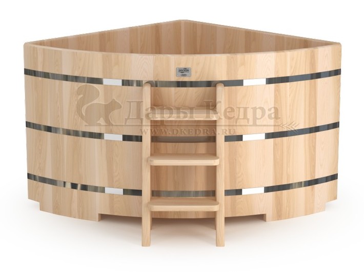 • Угловая купель для бани из кедра Это треугольная емкость для воды из кедра. Она предназначена для отдыха и охлаждения тела после банных процедур. Купель устанавливается в угол помещения, что идеально для не больших пространств. Так же подходит для уличного использования. Угловая купель оснащена лавочками, приставной и внутренней лестницей из кедра. За счет стяжных болтов обручи из нержавеющей стали плотно прилегают к кедровой купели. Это позволяет равномерно распределять нагрузку воды и сохранить форму изделия в период эксплуатации. При правильном уходе угловая купель для бани не рассыхается и не подвергается гниению. Обязательно обращайте внимание на ширину дверных проёмов. Если они не позволяют занести изделие в собранном виде, то рекомендуем заказать разборную модель купели, которая оплачивается отдельно. При взаимодействии древесины кедра с водой активируются эфирные масла и фитонциды, благодаря чему организм насыщается полезными веществами.