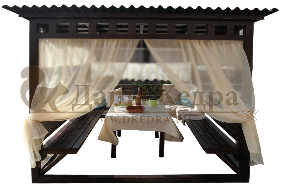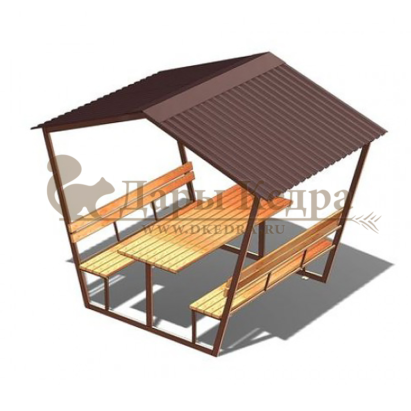 • Беседка из металла Беседка выполнена из стальной квадратной профильной трубы 40х40 мм. Лавки и стол обшиты кедровой доской. На крыше - ондулин. Беседка отличается простотой в установке, легкостью конструкции, долговечностью, прочностью и классическим дизайном, который впишется в любой интерьер приусадебного участка. Вокруг такой беседки можно организовать ландшафт из вьющихся растений, которые красиво создадут зеленые 'стены' снаружи и уют внутри. Размер стола у разных моделей варьируется в зависимости от ширины конструкции.