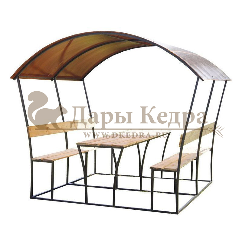 • Беседка из металла и поликарбоната Беседка выполнена из стальной квадратной профильной трубы 40х40 мм. Лавки и стол обшиты кедровой доской. На крыше - поликарбонат. Беседка отличается простотой в установке, легкостью конструкции, долговечностью, прочностью и классическим дизайном, который впишется в любой интерьер приусадебного участка. Вокруг такой беседки можно организовать ландшафт из вьющихся растений, которые красиво создадут зеленые 'стены' снаружи и уют внутри. Размер стола у разных моделей варьируется в зависимости от ширины конструкции.