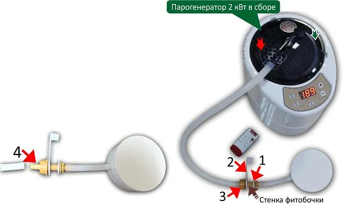 - Второй конец паропровода вставляется снаружи бочки в выведенное отверстие - 4.