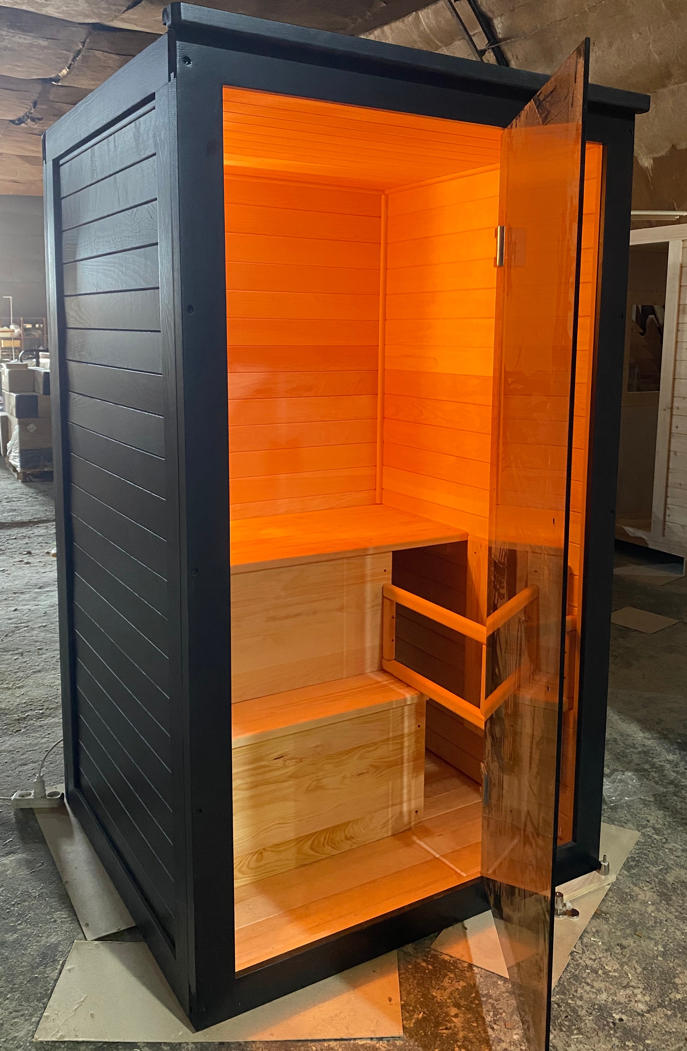 Это специально оборудованная готовая деревянная кабина для сухого и влажного парения. Электропечь нагревает пространство внутри и позволяет сбрызгивать камни водой, слегка увлажняя воздух. Такая процедура позволяет избежать перегрева. Каркас сауны выполнен из массива кедра, снаружи и внутри обшит липовой вагонкой сорта «Экстра» и имеет теплоизоляционный слой. Также двухуровневый полок идёт из кедра для обогащения внутри кабины полезными фитонцидами, а в сочетании с противовирусными свойствами липы сауна становится настоящим источником здоровья.